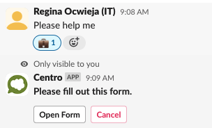 React to a message with an emoji, and you'll receive a prompt to complete a Centro form.