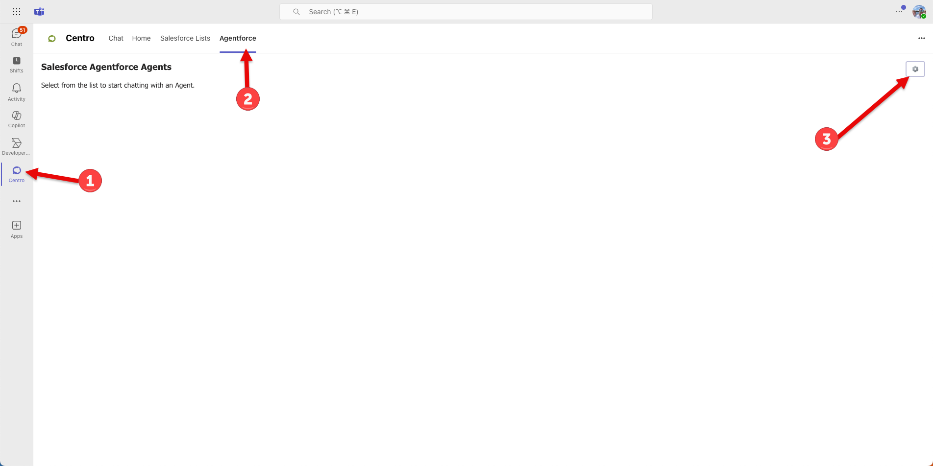 In Microsoft Teams → Centro App -> Agentforce Tab