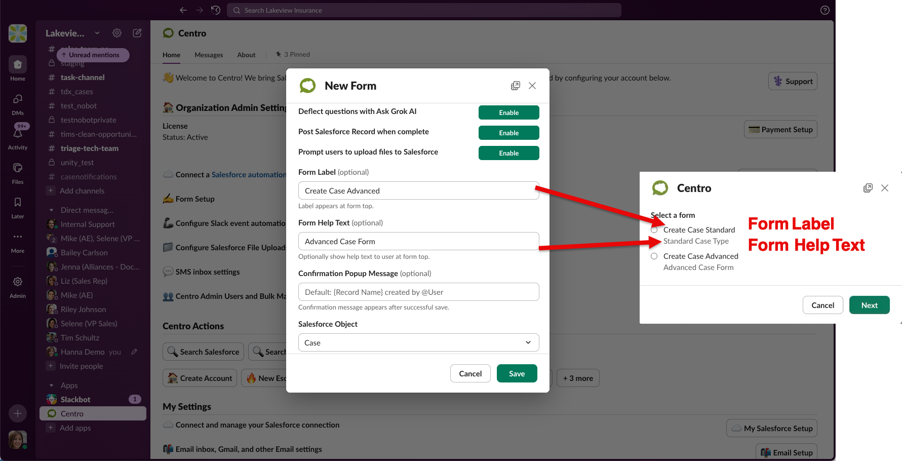1. Set up your Centro Forms. Make sure to define the Form Label and Form Help text. This will map to the ratio buttons displayed on the Modal when a user triggers a Centro form: