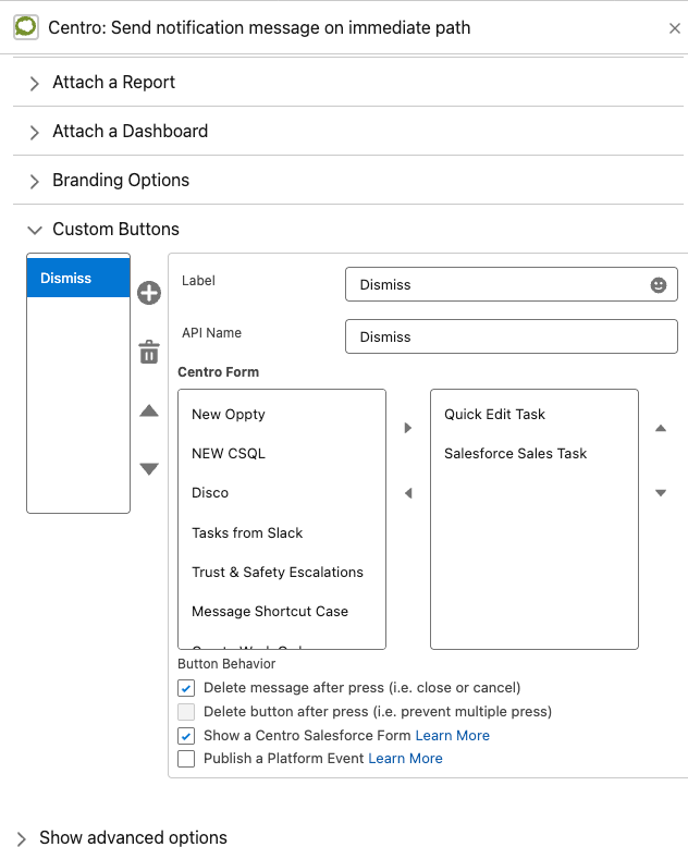 For Salesforce: After adding the Send Notification Flow element, expand the Custom Buttons section, then check "Show a Centro Salesforce Form". You'll be presented with a Multi-value pick list option to add up to 10 Forms to appear after the button is clicked: