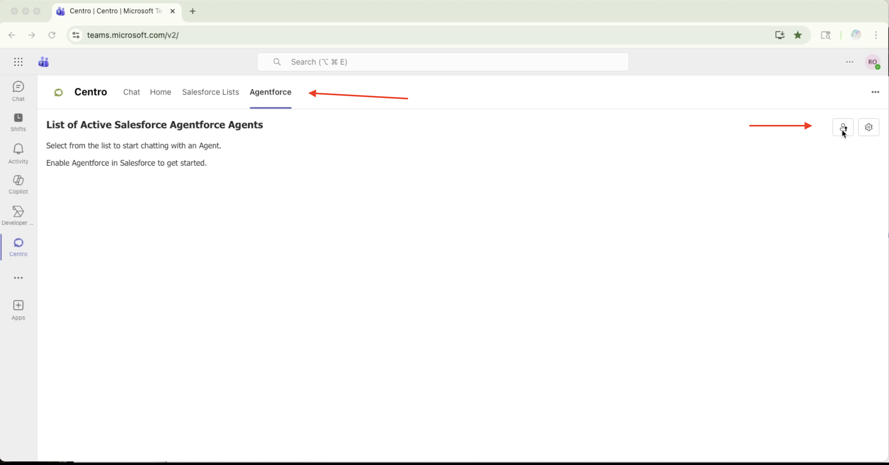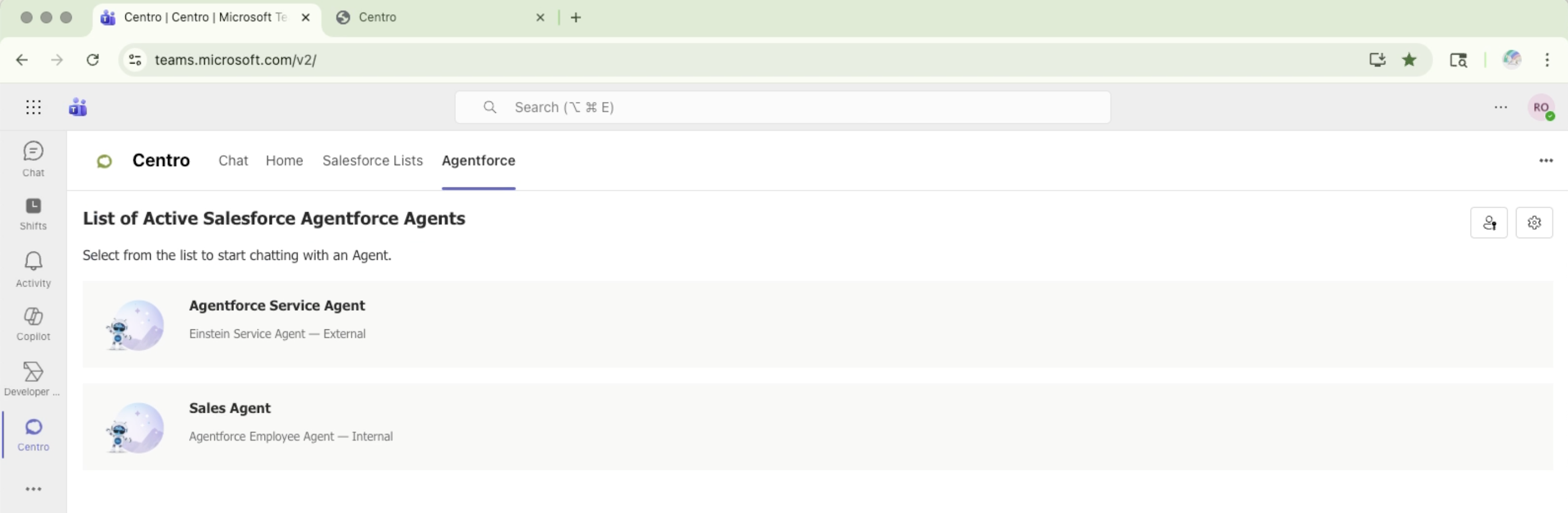 This article explains how to authenticate your Microsoft Teams user to your Salesforce user so you can access the Agentforce agents you're permitted to use within Centro.