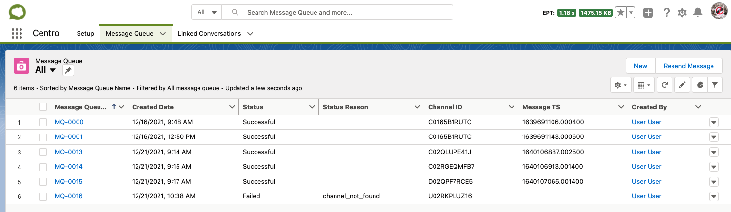 When a Centro message fails to deliver to Slack, a Message Queue record will have a status of "Failed," if an error code is available, it will appear in the Status Reason field. The error is usually a Slack API error code; refer to Slack Documentation for more information. Suppose the reason for the failure can be remedied, for example, by inviting the Centro app to a private channel. The message may be resent by selecting one or more Message Queue records and clicking the "Resend Message" List View button. Once processed, the existing Message Queue record will be updated to show a "Successful" status or an updated error status.